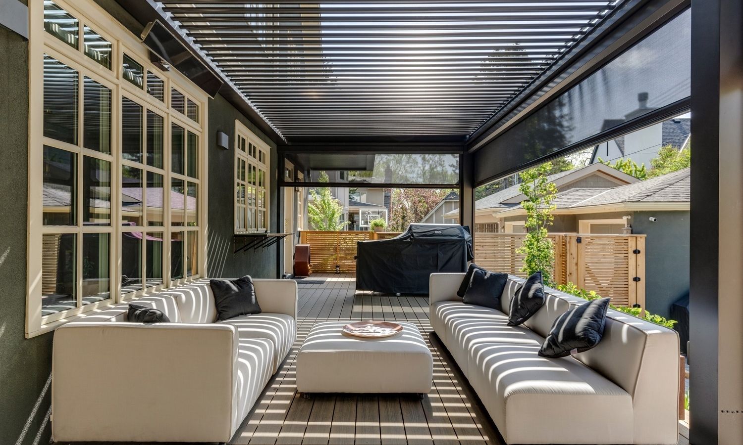 Using premium exterior shading solutions and outdoor-rated fixtures, we help you control sunlight, heat, and privacy while reducing glare on outdoor TVs and improving daytime viewing. Built for Florida’s humidity, storms, and coastal air, these systems blend refined style with everyday functionality to elevate both mid-day comfort and evening ambiance.